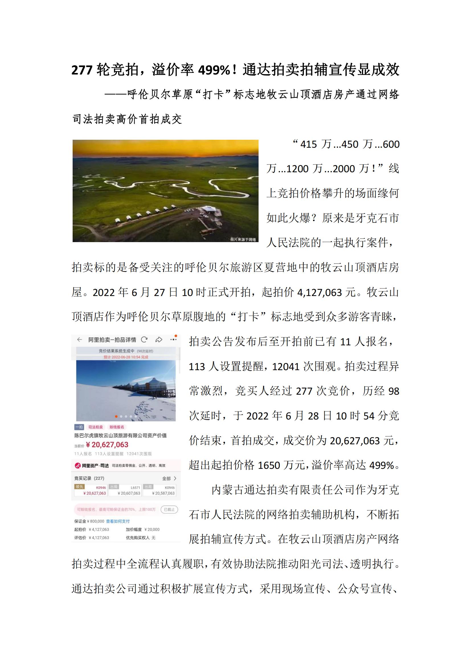 專業(yè)拍賣機構,助力司法拍賣 我區(qū)拍賣企業(yè)開始入圍法院司輔機構已經(jīng)兩年有余,在入圍的這兩年多時間里,拍賣企業(yè)作為專業(yè)的拍賣機構不斷的完善自身,利用我們的專業(yè)助力司法拍賣,提高司法拍賣的成交額。拍賣企業(yè)的專業(yè)就是拍賣,作為司法輔助機構,我們拍賣企業(yè)更能夠從委托方角度出發(fā),從標的角度出發(fā),從競買人的角度出發(fā),深刻的了解各方的切實需求。也更可以找到標的的亮點從而非常專業(yè)的對其進行宣傳,通過拍賣企業(yè)本身的客戶資源以及通過網(wǎng)站、公眾號、宣傳視頻等多種新的宣傳自媒體齊發(fā)力,已經(jīng)突破了地域限制,使得更多的潛在買家可以看到和了解標的。同時專業(yè)的拍賣公司有著強大的拍賣實力和風控能力,對于拍賣過程中出現(xiàn)的問題以及未出現(xiàn)的問題都會做到提前準備預案,這樣為標的的最后成交奠定了專業(yè)而扎實的基礎。因為術業(yè)有專攻,讓專業(yè)的人做專業(yè)的事更能讓他們發(fā)揮所長,讓價值得到最大化,也能盡快的找到解決辦法,從而節(jié)省成本。 昨天收到來自內(nèi)蒙古通達拍賣有限責任公司的好消息,位于呼倫貝爾草原“打卡”標志地的“牧云山頂酒店”房產(chǎn)網(wǎng)絡司法拍賣通過該企業(yè)的輔助宣傳,網(wǎng)絡拍賣產(chǎn)生了激烈的競價,經(jīng)過277 輪競價后,最終以 20,627,063 元成交,溢價率達到 499%。 這便是一個很好的例子,希望我們?nèi)珔^(qū)的拍賣企業(yè)都能充分發(fā)揮自身專業(yè)優(yōu)勢,助力司法拍賣,在這一領域開疆擴土,以此為契機,從點到線再到面的全面發(fā)展。